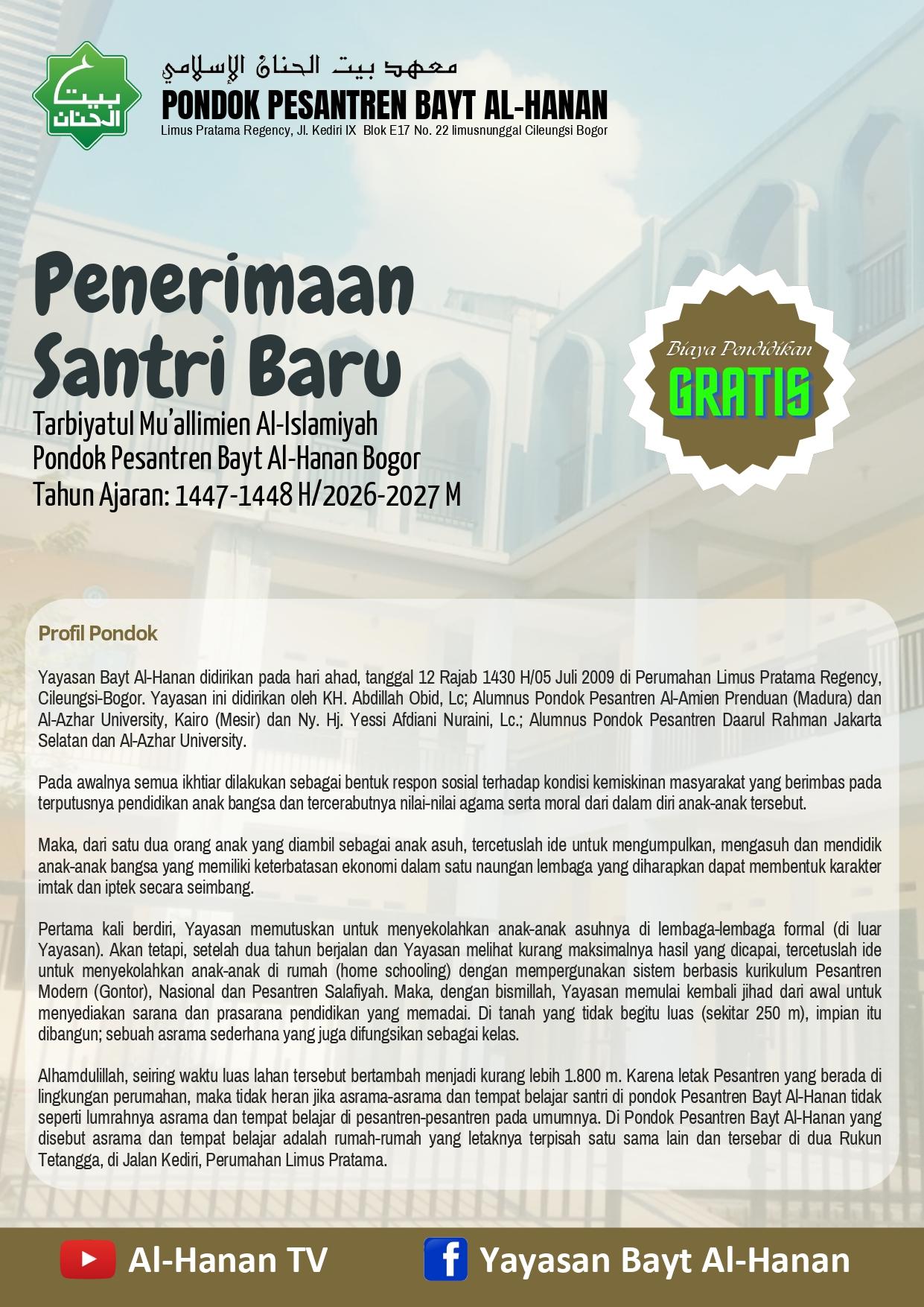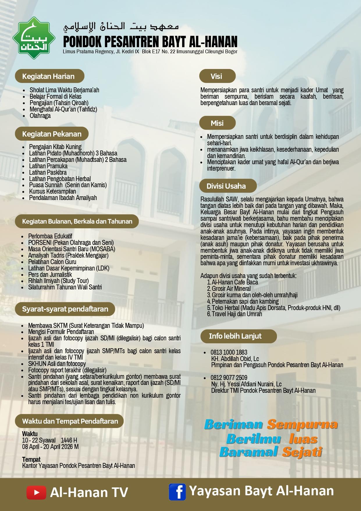 Yayasan Bayt Al-Hanan didirikan pada hari ahad, tanggal 12 Rajab 1430 H/05 Juli 2009 di Perumahan Limus Pratama Regency, Cileungsi-Bogor. Yayasan ini didirikan oleh KH. Abdillah Obid, Lc; Alumnus Pondok Pesantren Al-Amien Prenduan (Madura) dan Al-Azhar University, Kairo (Mesir) dan Ny. Hj. Yessi Afdiani Nuraini, Lc.; Alumnus Pondok Pesantren Daarul Rahman Jakarta Selatan dan Al-Azhar University.
